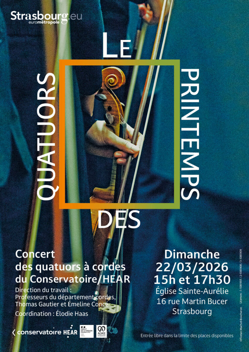 Vous aurez l’occasion d’entendre 18 quatuors issus du Conservatoire de Strasbourg et de la HEAR-Musique répartis en deux concerts.