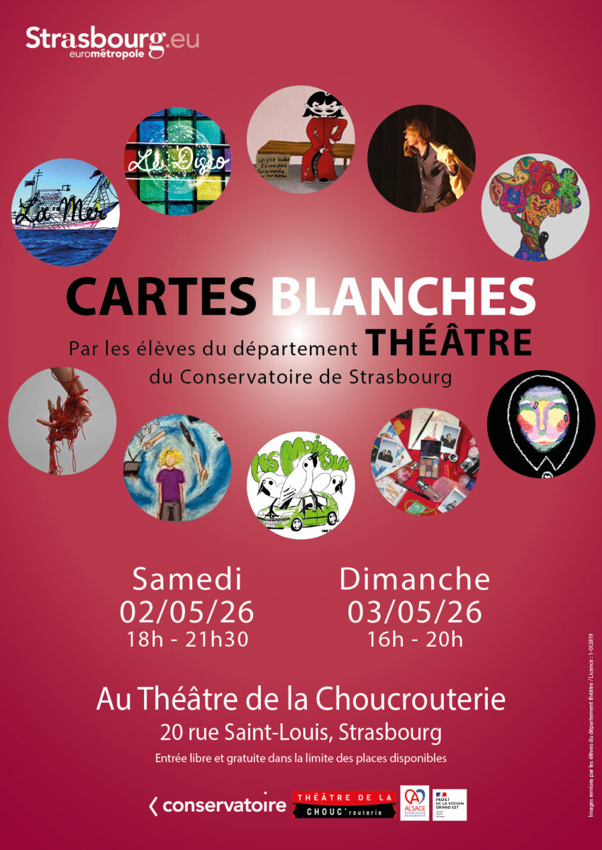Pour la première fois, le Conservatoire et le Théâtre de la Choucrouterie offre aux élèves du département théâtre du Conservatoire, l’opportunité de présenter leurs projets artistiques lors d’un week-end de cartes blanches à la Choucrouterie.